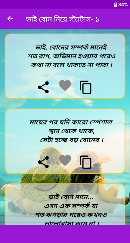আসসালামু আলাইকুম কেমন আছো সবাই। ভাই বোন নিয়ে স্ট্যাটাস- অ্যাপটি তে রয়েছে নিত্য নতুন কন্টেন্ট, ভাই ও বোনদের মিষ্টি সম্পর্ক ও হালকা হালকা মিষ্টি ঝগড়া দিয়ে সাজানো হয়েছে প্রত্যেকটি স্ট্যাটাস, ভালো লাগার মতো একটি অ্যাপস- এই অ্যাপটি বানানোর আগে অনেক রিসার্চ করা হয়েছে কোথাও এই রকম একটি অ্যাপ পাওয়া যায় নাই , তাই আমি নিজেই অনেক মেহনত করে এই অ্যাপটি বানালাম আপনাদের সকলের জন্য- একটু উদাহরণ দেই- বোন তো সেই হয় যে সর্বদা ভাইয়ের খবর রাখে। কোন ভাই চায় না তার বোন কারো কাছে অসম্মানিত হোক।