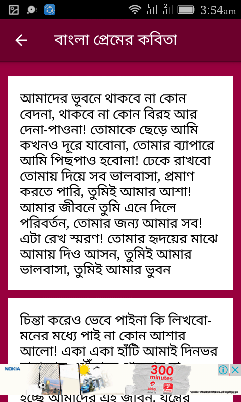 কবিতা পড়তে কে না ভালবাসে। আর প্রেমের কবিতা হলে তো কথাই নেই। প্রেমের আবেদন চিরন্তন সাথে প্রেমের কবিতারও। অনেক গুলো লেখকের প্রেমের রোমান্টিক কবিতা গুলো একসাথে করা হয়েছে।বাংলা কবিতা সমগ্র এপসটি প্রখ্যাত বাঙালি কবিদের বাংলা কবিতার এক বিশাল সংগ্রহশালা। আমাদের বিশ্বাস আমাদের এই ক্ষুদ্র প্রচেষ্টা বাংলা সাহিত্য, কবিতা ও আমাদের দেশীয় কৃষ্টি-কালচারকে বিশ্বের নানা প্রান্তে ছড়িয়ে থাকা নতুন প্রজন্মের বাঙালিদের কাছে আরও পরিচিত করে তুলবে।কবিতা আমাদের মন কে প্রফুল্ল রাখে। কবিতার মাধ্যমে আমরা আমাদের জগত সমন্ধে অনেক কিছুই জানতে পারি। কবিরা কবিতার মাধ্যমে তাদের মনের ভাব প্রকাশ করে থাকেন। কবিতা আমাদের চলার পথে সাহসের জোগান দেয়। ভাল কাজে আমাদের এগিয়ে যেতে সাহায্য করে। তাই বাংলার জনপ্রিয় সব কবিদের সেরা কবিতা সমূহ সংগ্রহ করে আমরা তৈরি করেছি আমাদের এই কবিতার এপস টি।