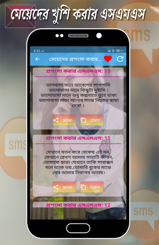 মেয়েদের মন জয় করতে আমাদের বিশেষ আকর্ষন মেয়েদের প্রশংসা বা খুশি করার শ্রেষ্ঠ এস.এম.এস। সুন্দরি মেয়েদের পটাতে এবং মেয়েদের প্রেমের ফাদে ফেলতে হলে আপনাকে অবশ্য মেয়ে পটানোর টিপস গুলো যানতে হবে। মেয়ে পটানো রোমান্টিক কথা যানতে হবে। অল্প বয়সে মেয়েদের সাথে কথা বলতে বা মিশতে গেলে বেশিরভাগ ছেলেই খুব নার্ভাস অনুভব করেন। আর এ কাজটি আপনাকে সহজ করতে আমাদের আছে মেয়েদের খুশি করার এস.এম.এস ছন্দ,ভালবাসার মেসেজ,প্রেমের ছন্দ,বাংলা মেসেজ, ইত্যাদি এ্যাপ গুলো।