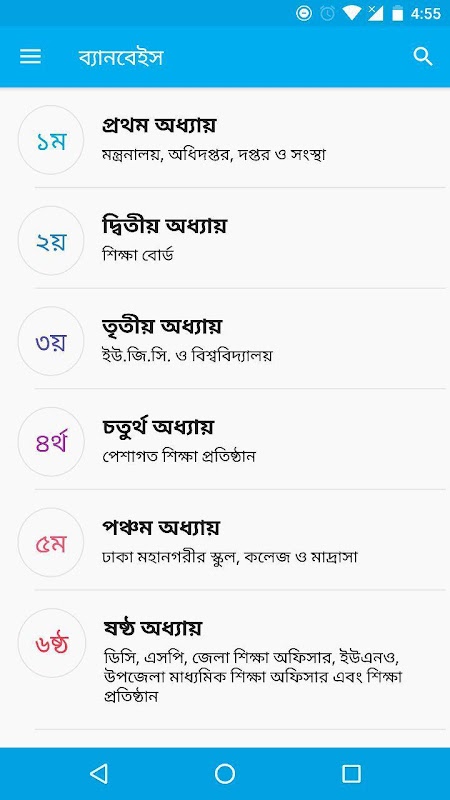 অ্যাপটিতে সকল তথ্য সাতটি অধ্যায়ে সুবিন্যস্ত রয়েছে, যার মাঝে খুঁজে পাওয়া যাবে সরকারি এবং বেসরকারি বিভিন্ন প্রতিষ্ঠান ও কর্মকর্তার গুরুত্বপূর্ণ ফোন নাম্বার, ইমেইল ঠিকানা, ফ্যাক্স এবং ওয়েবসাইট। আরো রয়েছে শিক্ষা বিষয়ক আলাদা আলাদা তথ্য। রয়েছে বিভিন্ন মন্ত্রনালয় ও সরকারি কর্মকর্তাদের সাথে যোগাযোগের ব্যবস্থা।