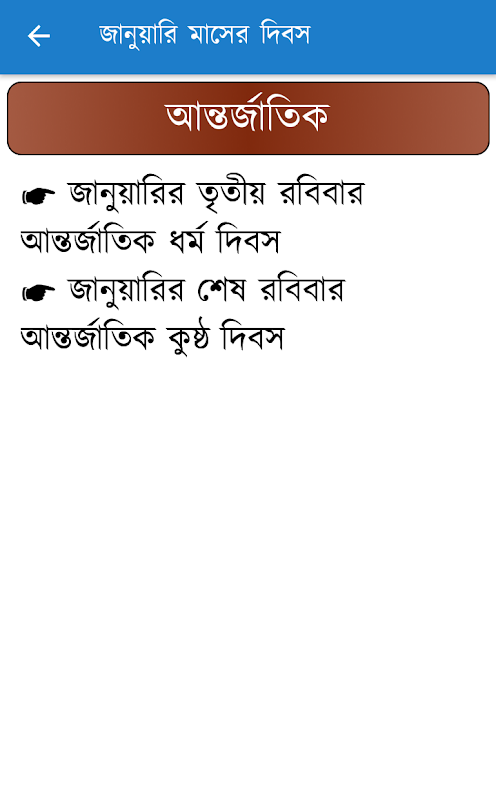 Toutes les journées nationales du Bangladesh et sa description historique peuvent être trouvées via cette application. Les événements du Jour de l'Indépendance, du Jour de la Victoire, du Jour des Martyrs de la Langue du Bangladesh ont été mis en évidence.