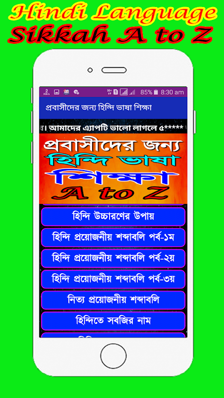 প্রবাসীদের হিন্দি ভাষা শিক্ষা দেওয়ার লক্ষ্যে নিয়ে আমাদের আজকের আয়োজন “হিন্দি ভাষা শিক্ষা “ অ্যাপটি। প্রবাসী আছেন যারা অনেকেই হিন্দি ভাষাভাষী বিভিন্ন দেশে বসবাস করেন তাদের জন্য হিন্দি ভাষা শিক্ষা নেওয়া খুবই জরুরি। তাই খুব সহজেই যাতে হিন্দি ভাষা শিক্ষা নিতে পারেন সেজন্য আমাদের অ্যাপটি তৈরি করা হয়েছে। হিন্দি ভাষা শিখতে হলে আজই আমাদের অ্যাপটি ডাউনলোড করুন।