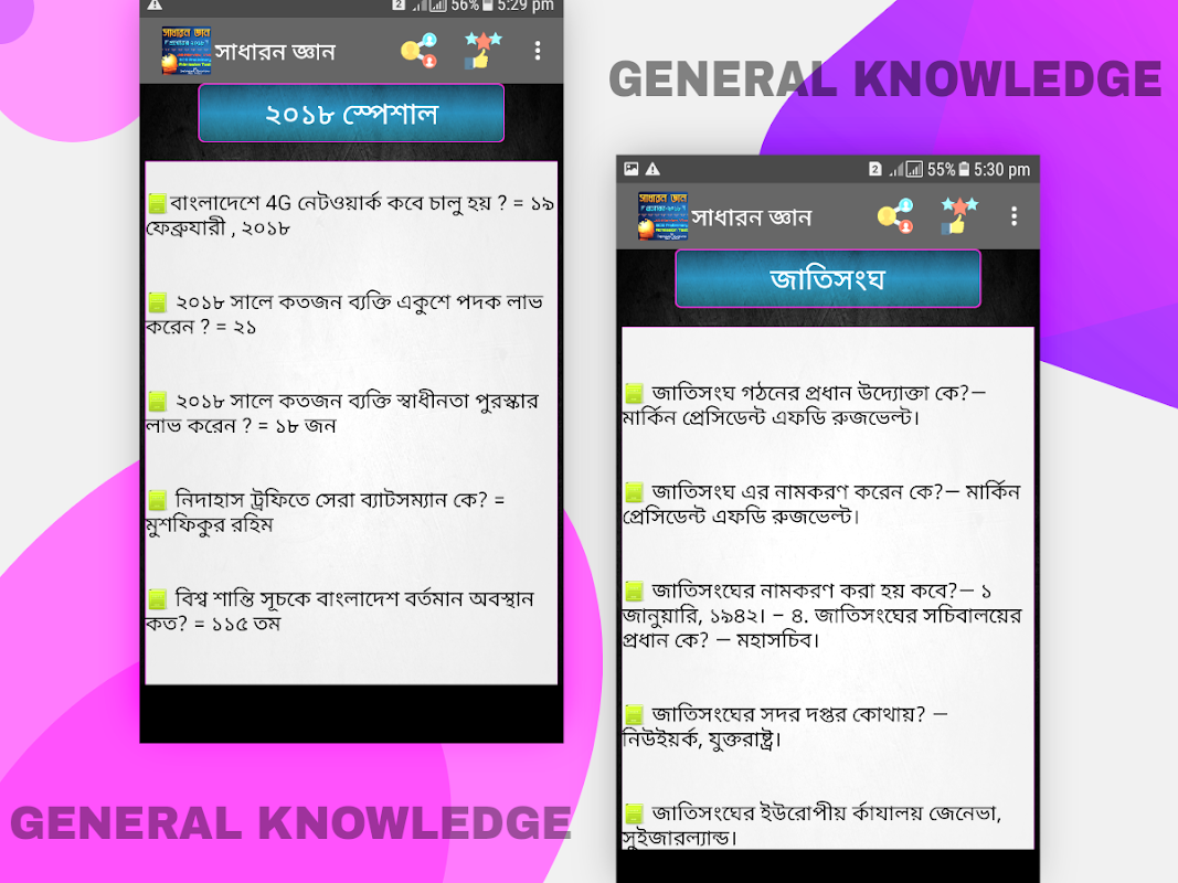 পড়ালেখায় ভালো ফলাফল করা, পড়ালেখায় মনোযোগী হওয়া, অথবা বিশ্বের না জানা অনেক কিছু জানা যায় সাধারন জ্ঞান প্রশ্নোত্তর জানলে। চাকরীর খবর পেলে যেমন সবার ইন্টার্ভিউ দেওয়ার সাধ জাগে। তেমনি চাকরি পেতে হলে ইন্টার্ভিউতে সাধারন জ্ঞানের প্রশ্ন গুলো মাথায় রাখতে হয়। ইংরেজি থেকে বাংলা, অথবা, বাংলা থেকে ইংরেজি, অথবা, ৩০ দিনে ইংরেজি শিখুন এপ গুলো নিয়ে সময় নষ্ট না করে জেনারেল নলেজ বাড়াতে সাধারন জ্ঞান এপ্টি পড়ুন। সাথে রাখতে পারেন, কোন রোগের কি ঔষধ।