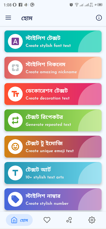 স্টাইলিশ ফ্রন্ট, ডেকোরেশন টেক্সট, টেক্সট রিপেক্টর, ইমুজি থেকে টেক্সট, বাংলা টাইপোগ্রাফি, ছবিতে বাংলা লিখন, টেক্সট আর্ট, স্টাইলিশ বাংলা কীর্বোড, স্টাইলিশ ফন্ট, স্টাইলিশ নাম ডিজাইন, টেক্সট অন ফটো, স্টাইলিশ নাম্বার ডিজাইন ইত্যাদি।