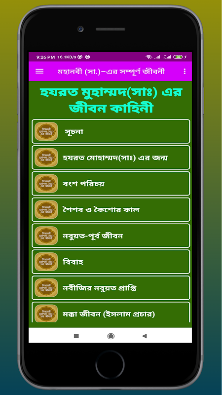 Nobijir jiboni bangla est une vie de prophète muhammad dans l'application bangla. Où vous obtiendrez une courte biographie de hazrat muhammad sallallahu alaihi wasallam. De nobijir jibon kahini, nous pouvons apprendre beaucoup de choses pour rendre notre vie éclairée. Nous savons que le hadith est nobijir bani, nous devons donc connaître tous les nobijir bani et apprendre d'eux. Vous pouvez également utiliser cette application bisso nobir jiboni hors ligne et la partager avec vos amis. De nobijir namaz, nous pouvons avoir une idée de la salat. À partir de cette application, vous pouvez lire l'histoire de la vie du prophète Mahomet de la naissance à la mort.
