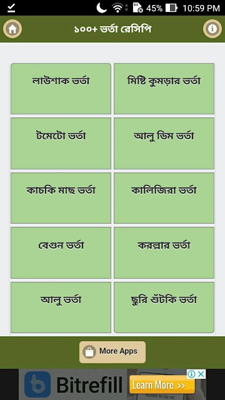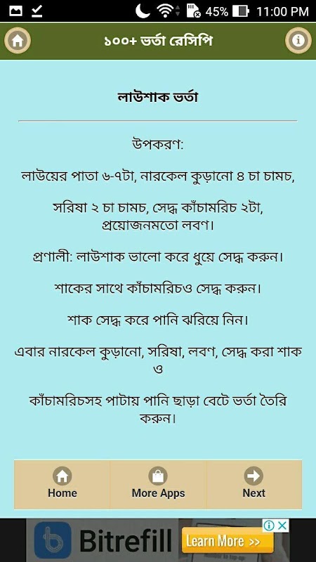 এই এপস এ আরও যা যা পাওয়া যাবেঃ স্পেশাল ভর্তা রেসিপি, ভর্তা রেসিপি, ১০০ রকম ভর্তা রেসিপি, নানারকম ভর্তা রেসিপি।