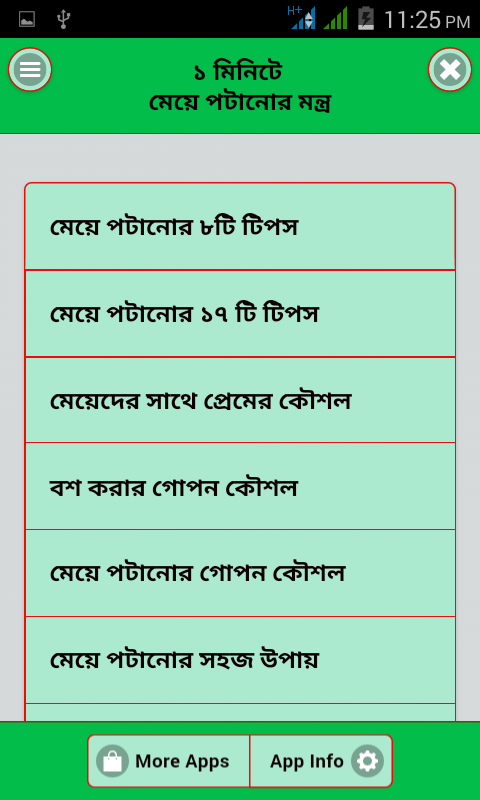 সব মানুষই স্বপ্ন দেখে যে মেয়েরা তাঁর জন্য পাগল হয়ে থাকুক এবং ডজন খানিক মেয়ে সব সময় তাঁর পিছিনে ঘুরুক কিন্তু মেয়ে পাগল করার সঠিক উপায় না জানার কারনে তা অনেক সময় হয়ে উঠে না। ১ মিনিটে মেয়ে পটানোর মন্ত্র অ্যাপ এ আমরা এমন কিছু জাদুকরী টিপস এবং জাদুটোনা যা অনুস্মরণ করলে যে কোন মেয়ে নিমিষেই আপনার জন্য পাগল হয়ে যাবে। আমাদের মেয়ে পটানোর উপায়গুলো খুবই কার্যকরী এবং এর ফলাফল প্রমাণিত। এই জাদু এবং টিপস ব্যাবহার করলে যে কোন মেয়ে ১ মিনিটের মধ্যেই আপনার জন্য পাগল হয়ে যাবে। আপনার কাছে শুনে হাসি পেতে পারে কিন্তু আমরা বলব আপনি যদি সত্যি কোন মেয়েকে পটাতে চান বা কোন মেয়েকে আপনার জন্য পাগল করতে চান তাহলে আমাদের অ্যাপটি অনুস্মরণ করুন দেখবেন নিমিষেই মেয়েরা আপনার প্রেমে পাগল হয়ে যাবে।