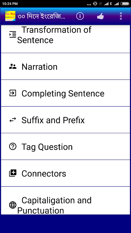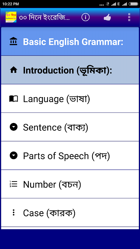 এই অ্যাপে ইংরেজি গ্রামার এর যে সব অধ্যায় নিয়ে বিস্তারিত আলোচনা করা হয়েছে তা নিম্নরূপ-