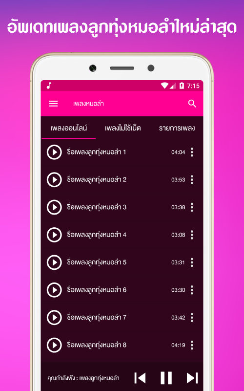 - อัพเดตเพลง ฟังเพลงลูกทุ่งหมอลํา ใหม่ๆ ให้กับผู้ใช้งาน