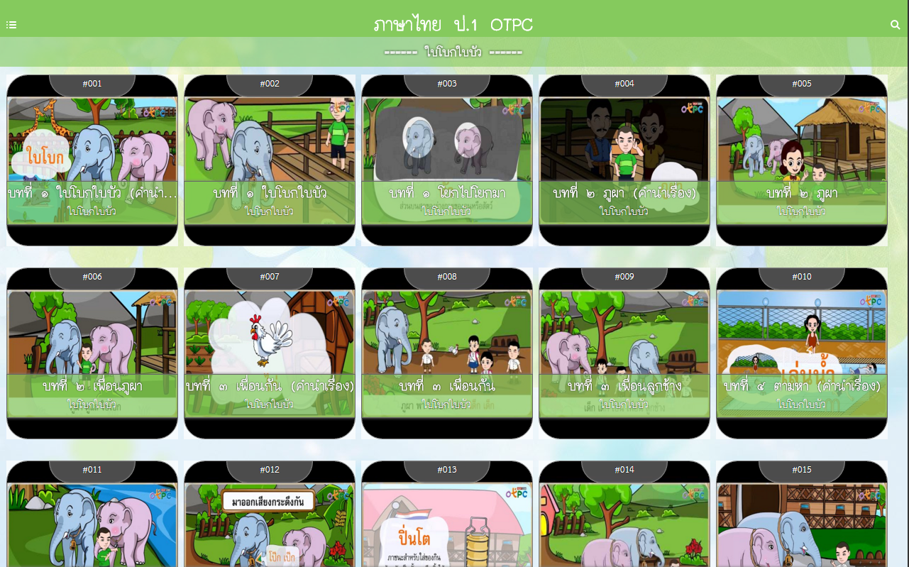 ภาษาไทย ป.1 OTPC ถอดบทเรียน จากสือโครงการ One Tablet Per Child (OTPC) ให้น้องๆ และผู้ปกครอง ได้ทบทวนบทเรียน จากที่บ้าน สามารถใช้ควบคู่กับหนังสือ เพื่อให้น้องๆ สนุกยิ่งขึ้น เนื้อหาประกอบด้วย