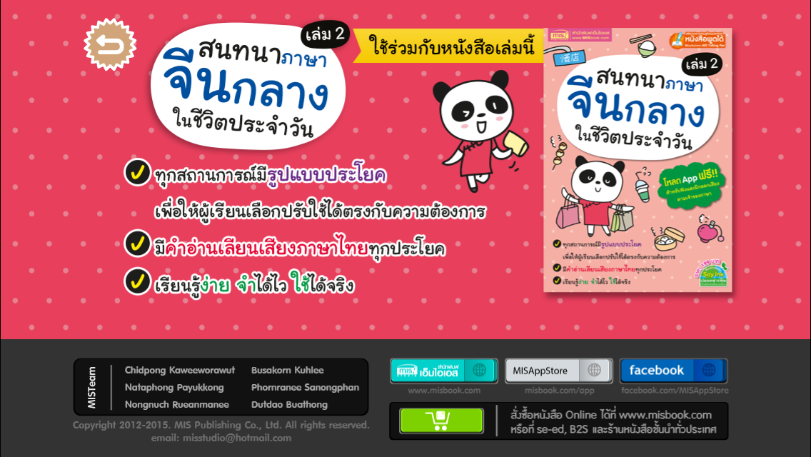 À partir parlent mandarin phrases de base dans diverses situations. Utilisé dans la vie quotidienne En couverture aux côtés de la nécessité de connaître de l'accueil aux pourparlers à diverses occasions. Dans chaque section, il ya une phrase. Alors que les apprenants peuvent être librement adaptés. Et chaque phrase aurait dû se lire imitant Thaïlande apprenants de langue d'assemblage pour pratiquer la lecture à haute voix comme un natif. Cet assistant, il est idéal pour ceux qui veulent utiliser. Bien qu'il n'y ait pas de base, vous pouvez apprendre aussi facilement.
