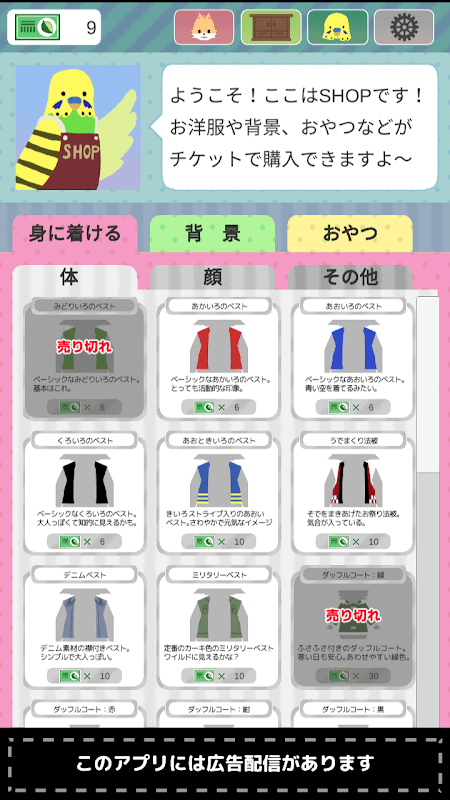 アプリ内の着替えや背景等のアイテムを入手するにはチケットが必要です。