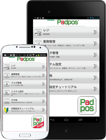 上位版の「Padpos」(有料)へバージョンアップしていただくと、今お使いのデータを引き継いだまま、本格的なPOSレジ機能をお使いいただけます。