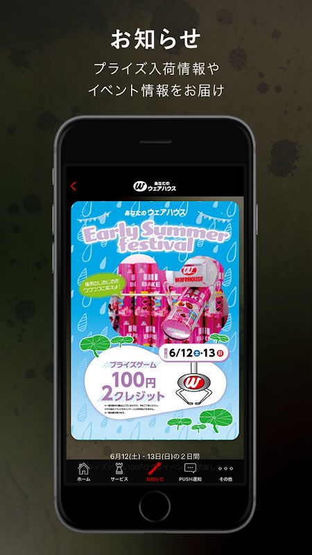 L'application officielle de la grande salle d'arcade "Your Warehouse" est née ! Non seulement les informations sur l'arrivée des prix et les informations sur l'arrivée du jeu, mais également les informations sur la campagne et les informations avantageuses sont fournies par notification push !