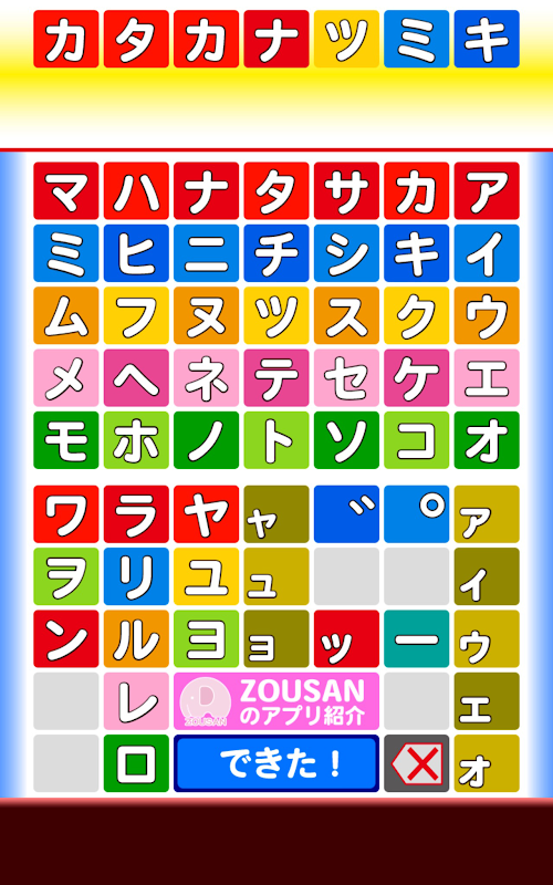 ひらがな、カタカナ、数字、アルファベットの文字積み木を並べて単語を作ったり、しりとり遊びをしたり、数字の積み木を並べて足し算引き算を学んだりできる学習アプリです