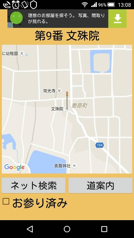 札所の一覧・地図上から見たい札所を選択すれば、札所周辺の地図を見たり、ウィキペディアで調べたり、ナビを起動することができます。