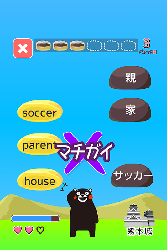 くまモンと英単語を覚える学習アプリです! 英単語と意味を上手に組み合わせて、熊本名物「いきなりだんご」をたくさん作ろう!!