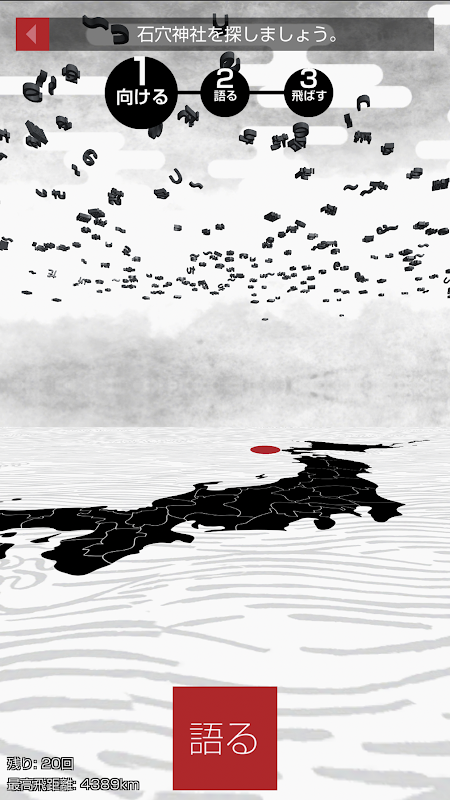 スマホに向かって唱えた願いが、3D の「ひとことだま」に変換されたら、 石穴神社の方向に向かって、フリック!
