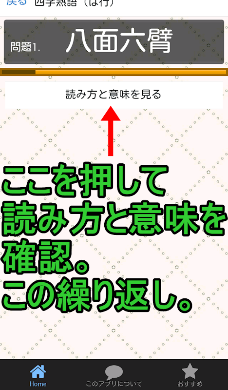 就職試験の国語のテストに出やすい故事、ことわざ、慣用句、四字熟語の意味を確認することができます。「読み方と意味を見る」ボタンを押しながら順次、確認していきます。