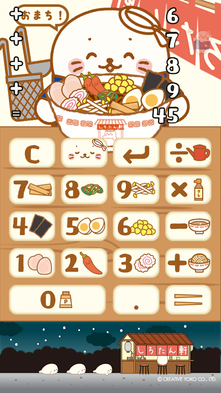 Une calculatrice mignonne et émouvante pour le bébé phoque du Groenland "Sirotan". Lorsque vous l'utilisez, Sirotan clignote et sourit! Vous pouvez utiliser la fonction mémoire et annuler le calcul.