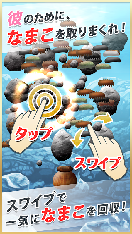 海に転がる岩をタップで破壊! 飛び散ったなまこに触れて回収しよう!