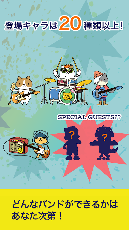 ギター、ドラム、ベース、ラッパー!いろんなねこをあつめてバンドを結成しよう! 笑えるバンドあるあるがいっぱい♪普段ゲームをしない人でも遊べる、お手軽アプリです♪