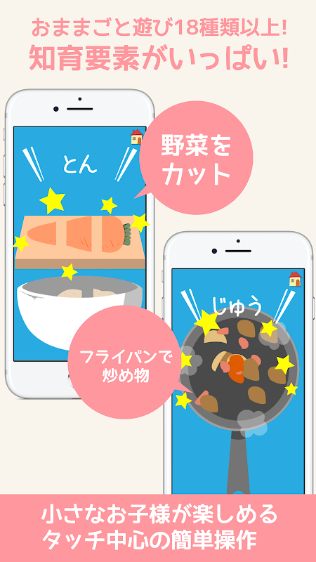 目玉焼きを焼く・お皿を洗う等の簡単な遊びだけでなく、野菜を切るところ始まるカレー作りや生地からこねるクッキー作り等20種類の遊びが楽しめるままごとアプリの決定版