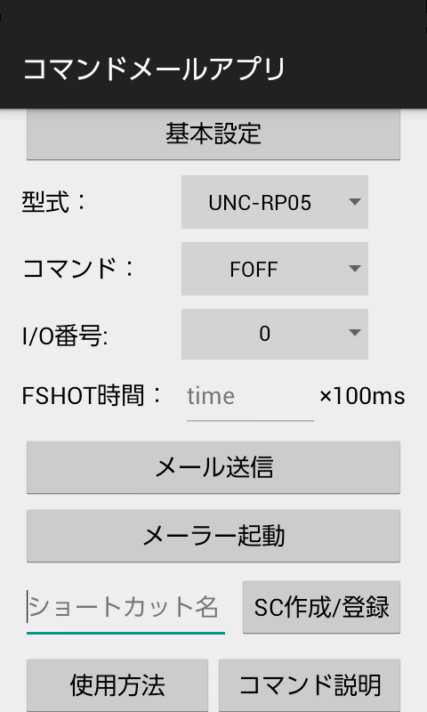 次にメイン画面にて、れんら君の型式やコマンド内容を設定してメール送信してください。