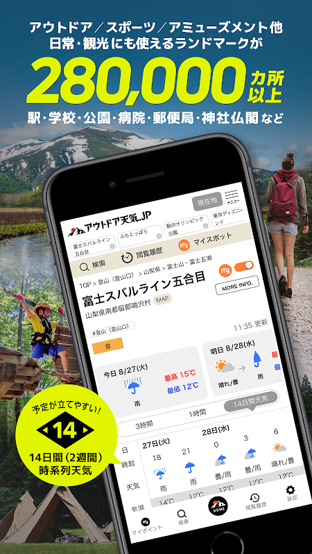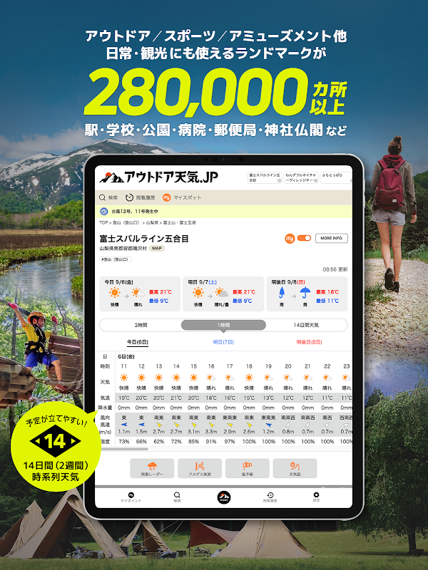 La raison pour laquelle il peut être utilisé facilement non seulement pour les activités de plein air telles que l'alpinisme et le camping, mais également pour sortir dans les parcs et dans la vie quotidienne autour des gares et des monuments, est qu'il dispose de données météorologiques précises pour chaque endroit et peut être utilisé. utilisé jusqu'à 14 jours à l'avance. Il fournit des prévisions météorologiques jusqu'à.
