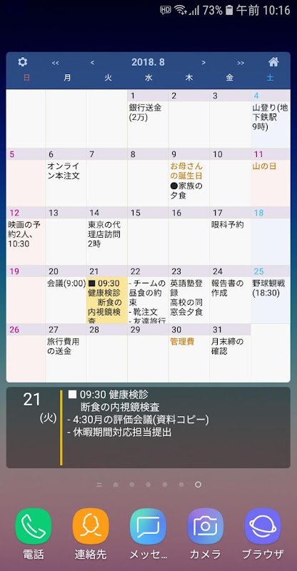 - 状態バーの今日日程 : 状態バーを下げれば、今日のスケジュール自動表示機能