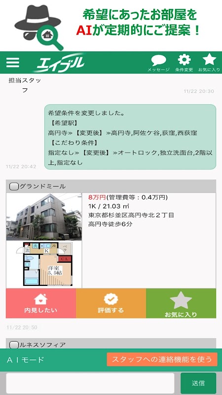 チャット型お部屋探しのエイブルAGENTアプリ版が、AIモード機能追加でさらに便利に!スタッフへ相談できる【AI応答+スタッフモード】への切り替えも可能です!