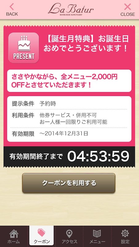 このアプリでは、ラバトゥールの色々な情報やアプリユーザー限定のお得なサービスが手に入ります!