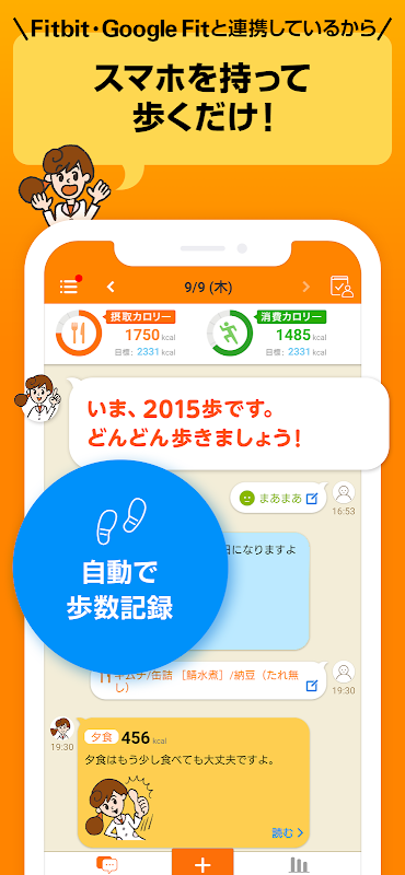 歩数はスマホの歩数計から自動取り込み。その日の消費kcalを自動計算します。