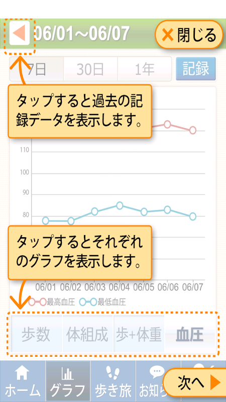 ●日々の振り返りを直感的に!日々の歩数や、記録した体重/血圧を見やすいグラフで確認できます。