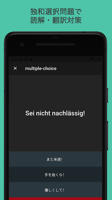 当アプリは全くドイツ語が聞き取れない学習者がネイティブの会話を理解できるようになるために、レベル別に問題を配置、基礎的なリスニング力が身につくよう、独自のメソッドでアプリを作成いたしました。