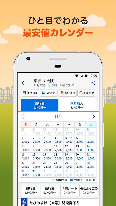 料金の安い順、出発時間が早い順など、急いで探すときも見やすく並べ替えできます