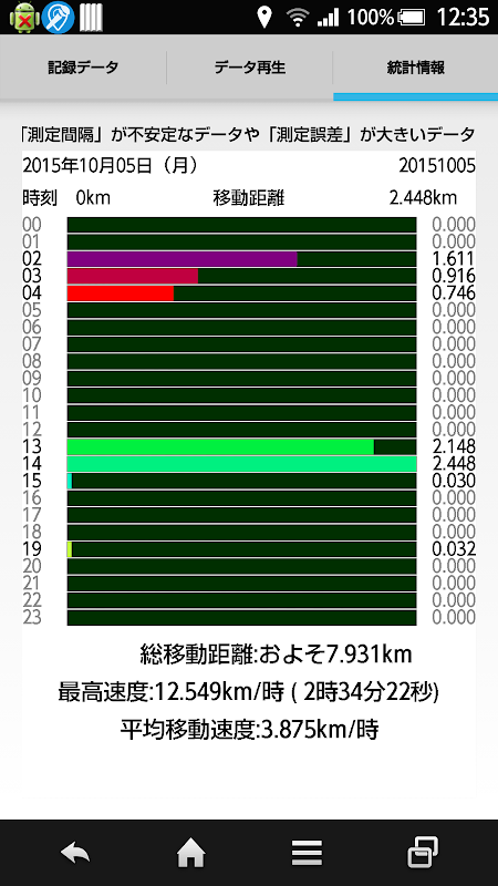 位置情報を元に「移動距離」「最高移動速度」「平均移動速度」の確認ができます。