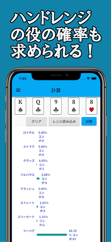 このアプリでは、自分で相手のプリフロップハンドレンジを作成・保存し、エクイティの計算ができたり、そのレンジがあるボードに対してそれぞれの役がどのくらいの確率でできるかを計算します。