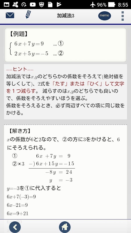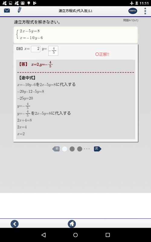 Application pour une pratique approfondie des équations simultanées en deuxième année de collège Vous pouvez pratiquer des calculs allant des problèmes de base aux problèmes de développement du niveau de l'examen d'entrée au lycée.