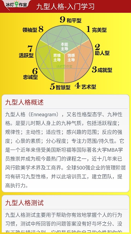 Ennéagramme, également connu sous le nom de typologie de personnalité et neuf types de personnalité. Voici les neuf tempéraments que les gens ont pendant la petite enfance, y compris le niveau d'activité ; régularité; initiative; adaptabilité; éventail d’intérêts; intensité de la réponse; qualité de l'état d'esprit; degré de distractibilité; et la portée/persistance de la concentration. Il a été très apprécié par les étudiants MBA d'universités de renommée internationale telles que l'Université de Stanford aux États-Unis ces dernières années et est devenu l'un des cours les plus populaires aujourd'hui. Il est devenu populaire dans les milieux universitaires et commerciaux en Europe et aux États-Unis au cours de la dernière décennie. Les dirigeants des entreprises du Fortune 500 ont tous étudié l’Ennéagramme et l’ont utilisé pour former leurs employés, constituer des équipes et améliorer l’exécution.