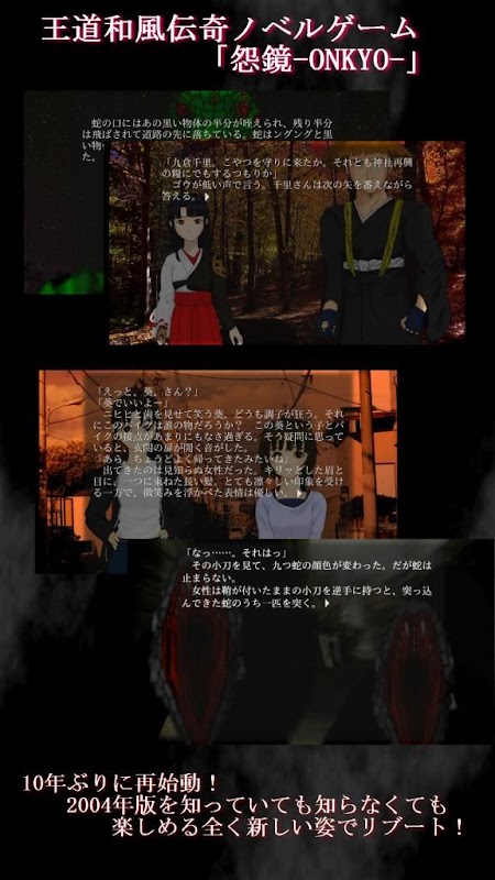 ※ご注意こちらは”長編伝奇ノベルゲーム「怨鏡-ONKYO-」”のIntel CPU (x86 Atom)対応版となります。まずはARM版をお試しください。