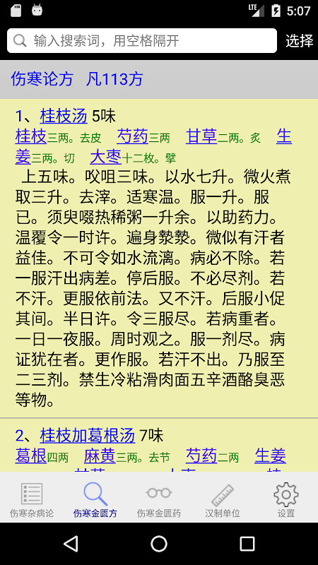该应用以表格形式展示了伤寒论398条原文及113方内容,以及可选的金匮要略的内容,可以方便的过滤搜索条文以作研究,或者输入数字编号直接滑动到某条条文以作学习,搜索框还支持多关键字查询,只要以空格隔开就可以,还支持通配符搜索,不过通配符为“#”或“.“,搜索结果中关键字会被染红,方便观看结果。这比直接看书要方便很多,每条条文点击后会弹出一个菜单,可以选择做笔记,复制内容,或定位到条文中涉及的方药内容查看。