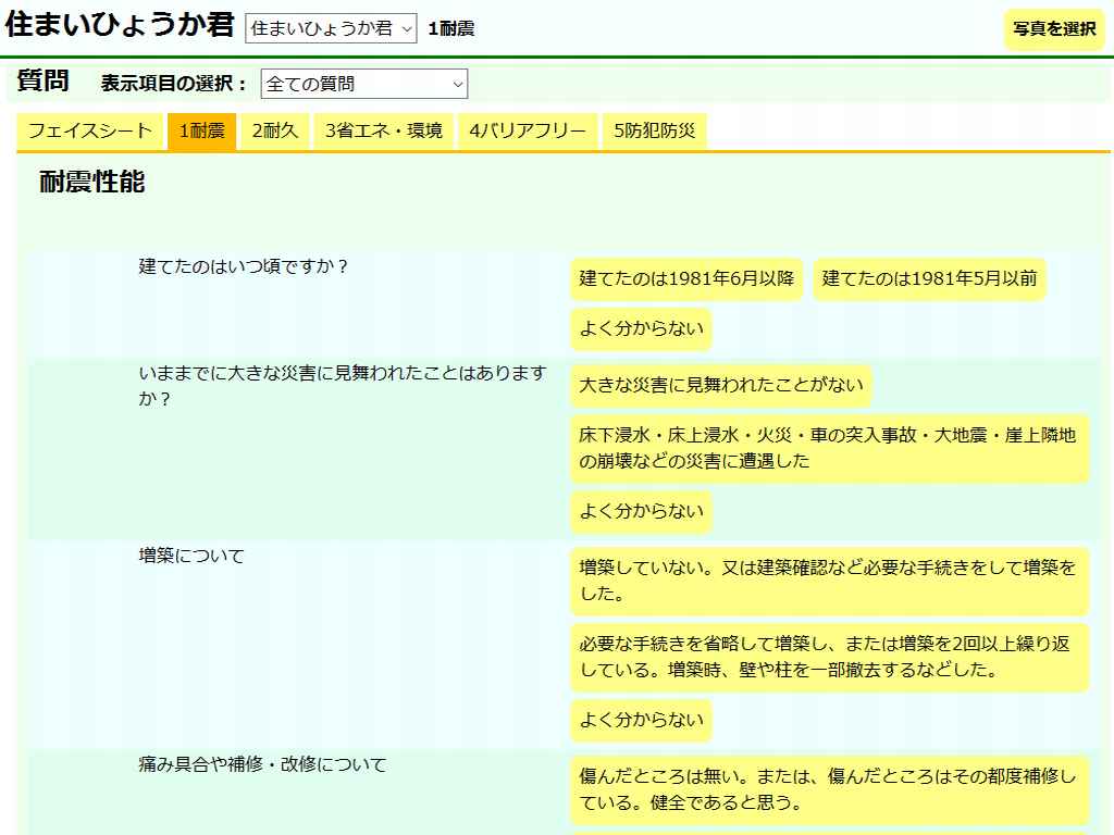 「住まいひょうか君」は、中古住宅の売買やリフォーム、リノベーションの計画段階で、住まいの現状を調査(インスペクション)したものを5つの性能別に簡易に見える化して、「お客様と事業者のコミュニケーションツール」として使用する目的で作成したものです。