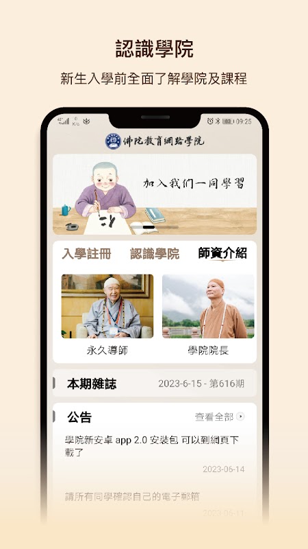 L'application "Buddha Education Network Academy" suit les enseignements de "l'enseignement de neuf ans" du vieux moine Jingkong. Les cours sont principalement basés sur des conférences en ligne, et les étudiants discutent entre eux en complément. La méthode d'enseignement consiste à utiliser une étude approfondie et à long terme, et à se concentrer sur l'écoute des Écritures.Après chaque cours, un rapport sur l'expérience d'apprentissage doit être soumis comme une réussite scolaire. Après avoir terminé le cours chaque année, vous pouvez mettre à niveau et entrer dans la prochaine étape de l'étude. Tout le monde est invité à étudier en ligne ensemble, à s'encourager mutuellement et vous ne serez pas seul à apprendre.