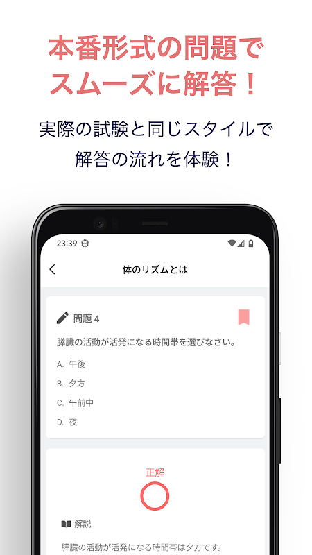 Cette application contient des questions de préparation au test « Health Management Ability Test Level 3 » parrainé par la Japan Adult Disease Prevention Association, une organisation à but non lucratif spécifiée.
