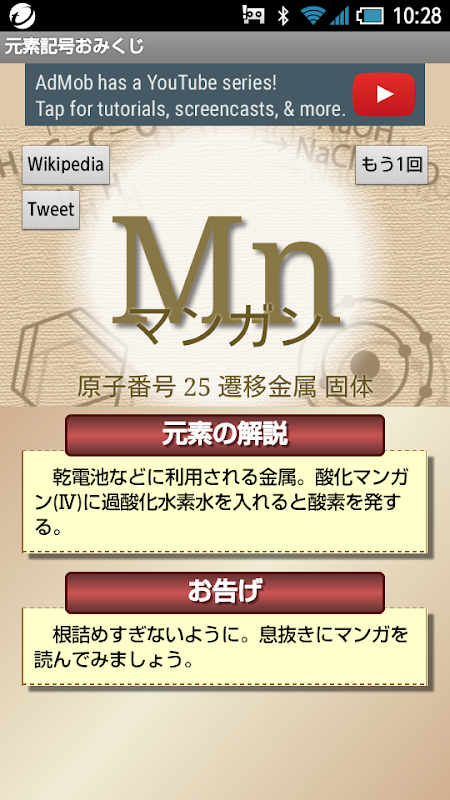 元素記号がいっぱい入ったおみくじを引いてみませんか。引いた元素にちなんだお告げが告げられます。結果をTwitterでつぶやくこともできます。