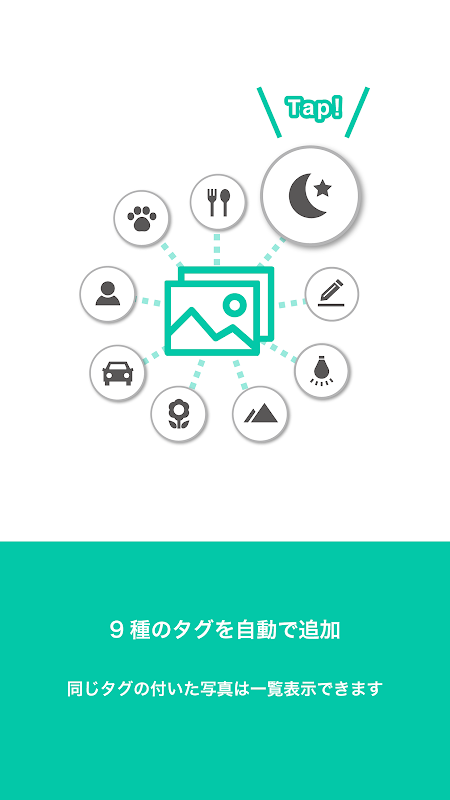 自動で解析された8つの分類(「ペット」「食べ物」「夜景」「乗り物」「花」「アウトドア」「インドア」「文字/イラスト」)と、「人」のアイコンを組み合わせて、あなたの見つけたい写真を楽しく、簡単に探し出すことができます。