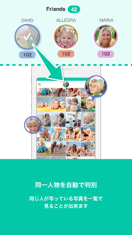 人物に関しては、写っている人の顔を個別に認識し、各個人の顔アイコンを自動で生成します。