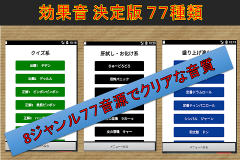 効果音77種類をアプリにて提供。 ジャンル別に効果音を振り分けてあるから使いやすい。 クイズ、宴会、肝試し、アニメ等、クリアなリアル音質ですぐに使える便利さ。
