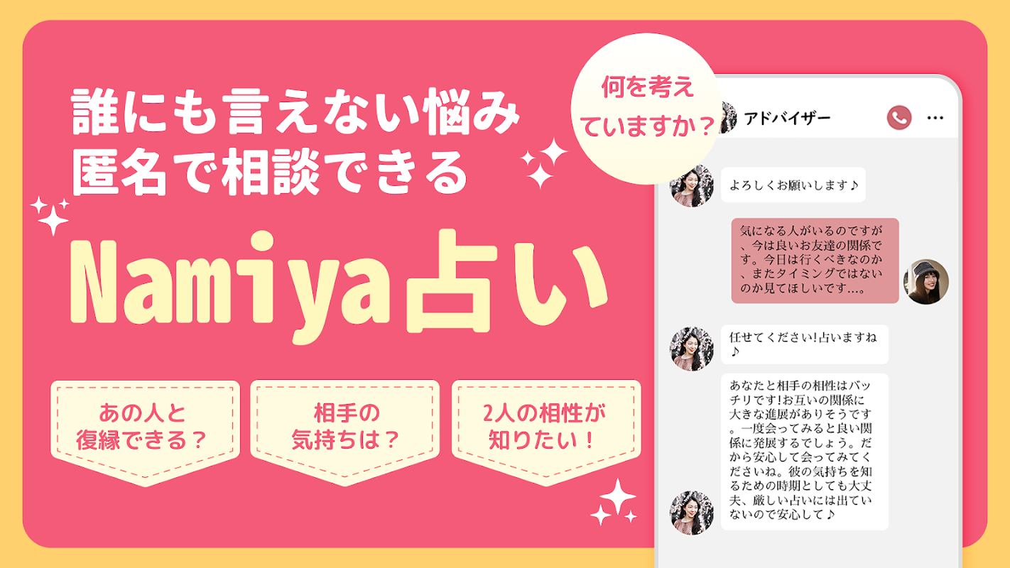 "Namiya Fortune Telling" est une application de divination populaire où vous pouvez consulter une diseuse de bonne aventure 24 heures sur 24, 365 jours par an.